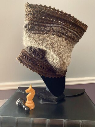 This elegant cowl is crocheted in the round, from one edge to the next. The top and bottom parts are mirrored from the center and are composed of 2 colors of yarn. The center piece adds a bit of warmth and structure to the cowl with a shell section made by holding 2 yarn strands together (fingering and lace).