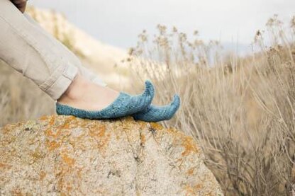 A playful take on traditional Persian slippers. While I was very tempted to make them more traditional - coming in to a point at the front opening too, embroidered, and with soles for outdoor use; in the end I settled somewhere in between Persian shoes and American slippers. Knit in the round from the top down, these slippers use short rows to shape the foot and create the curled toe. Yes - the way it is shaped causes the toe to spring up like that. No wire or fancy blocking needed!