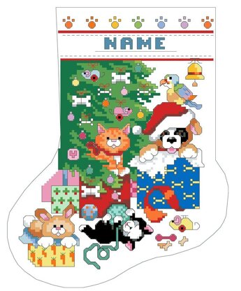 Designed by: Linda Gillum. This adorable cross stitch stocking features mischievous kitties and puppies and bunnies playing by the tree, encouraged by the parrot on top! вЂPurr-fectly’ thoughtful, it makes a whimsical Christmas gift idea for any pet lover on your holiday list.\n\n