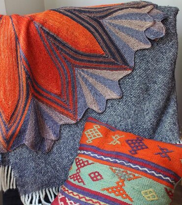This shawl consists of the same elements as Lotus Shawl, but those are arranged differently, and the color changes in different places.