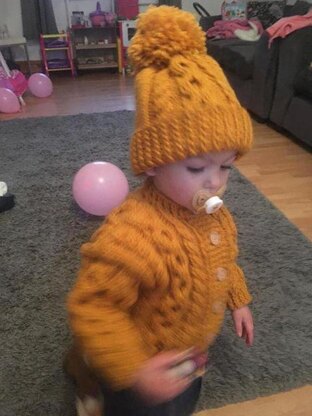 The pattern contains instructions for a Jacket, 2 styles of hat and booties to fit 16″, 18″ and 20″ chest and the end product is larger as it is a jacket, it would easily fit a 2 year old. This is an ideal knit for people new to cables.