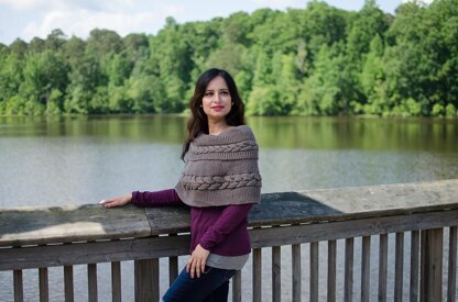 A capelet is a wonderful transitional piece when the weather is thinking about changing seasons. It is long enough to keep your shoulders warm, and short enough to stay out of the way of busy hands. Worked sideways in a chunky cable and garter stitch pattern, this piece is sure to be a favorite for fall.