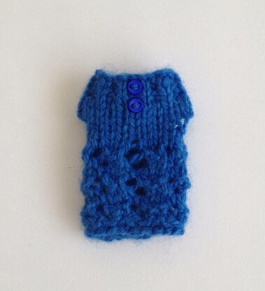 Sweet little teeny version of my Blythe Lacy Tunic dress that will fit your Petite Blythe! You will need the tiniest amount of laceweight yarn and 2mm needles for this. A good way to have a go at a lacy pattern before you try a full sized version. Knit all in one piece from the bottom up with a back seam.