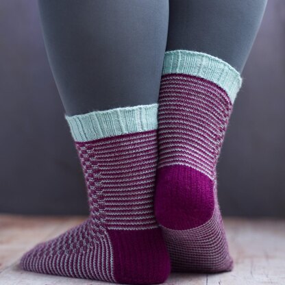 The Petite Pavement socks are a very simple knit and purl pattern but they use 3 colours of yarn to create an interesting effect. The small "blocks" are like tiny cobblestone blocks. Have fun combining colours and create your own version.