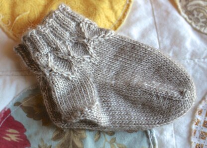 A simple, elegant little pair of baby socks designed to adorn the feet of a tiny comic. "Petite Pierrot" gets its name from the sad harlequin of traditional western theatre. The elegant little diamond pattern that encircles the cuff is sweet and whimsical. The construction is simple. Perfect for a first time sock-knitter! This is the ideal project for using up left-over sock yarn, or with just two Unicorn Tails you are set to go! Enjoy!