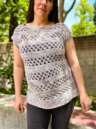 CONSTRUCTION: Worked from the bottom up and mostly in the round, with seaming needed only at the top of each shoulder. Yarn is attached to create short sleeves in the round.