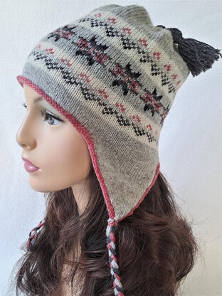 Upbeat twist to a traditional ethnic inspired hat. Ear flap style beanie for toddlers, children and adult/teens. Tassel and braided pigtail embellishments added. Easily completed in a few evenings.