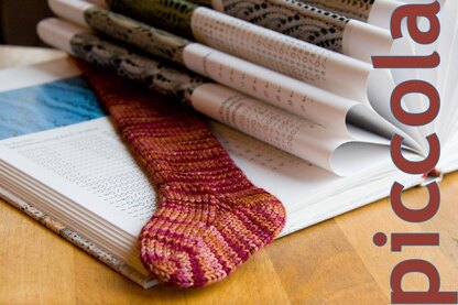 • About 20 grams of any pretty sock yarn is fine (like Wollmeise, Opal, Regia, Lorna’s Laces, Trekking, Blue Moon Fiber Arts, Old Maiden Aunt, Handu, Natural Dye Studio, etc) • Knit Piccola toe up on one or two circular needle(s), starting with Judy’s Magic Cast On • Pattern includes lots of photographs • Piccola features a gussets and a heel flap