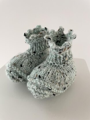 The Picot Booties knitting pattern features a pretty picot edging at the leg and can be knitted in variegated, speckled or solid yarn, flat and seamed or in the round and seamless. They are a quick and easy knit in DK weight yarn.