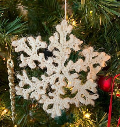 These picot snowflakes require only a few skills to make: knitted cast, on, knitting, and binding off. Sew the centre circle together, then use glue or fabric stiffener to form an ornament.