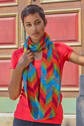 Take advantage of the possibilities arising from self-striping sock yarns—they aren’t just for socks! Turtlepurl Turtle Toes sock yarn is used for this modular-knit cowl, which would be equally remarkable as a scarf. The cowl is constructed from four strips, each one alternating increases and decreases that are joined as the adjacent strip is knit. The only sewing required is to join the ends forming a loop. The extra-long length maximizes styling options, allowing for a single or double loop around the neck. The ever-changing color sequence makes knitting this cowl fun and will delight every time it is worn.