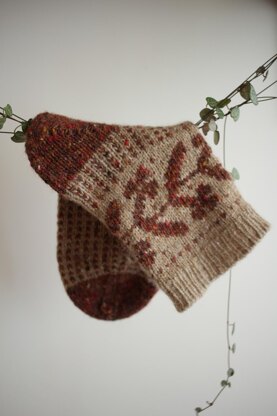 It is a sister design to my Pictus pullover. These are middle length socks: with a trim of floral colourwork on the cuff and contrasting German short row heel and toe. The socks are knit top-down in the round.