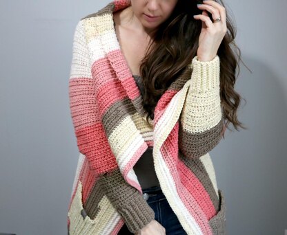 Fun whimsical design made in Caron Cakes features buttoned crossover design with ribbed edging and pockets. Pattern is worked in half double crochet in the front loop only. Pattern includes a full video tutorial for child size 4 cardigan available on Youtube!
