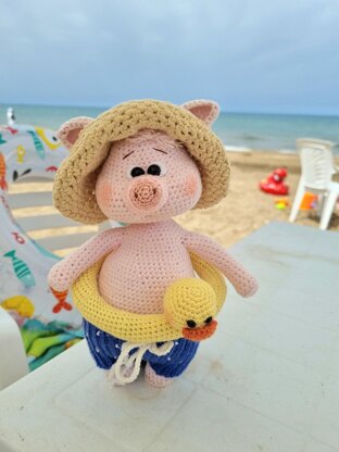 In this pattern, you will find the written instruction for crocheting the piggy toy and a set of clothes (summer hat + shorts + rubber ring + ice cream).