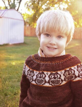 Sizes 12/18m [1/2T, 3/4T, 6/7, 8/10] Finished Measurements chest: 20.25 [23, 25, 27, 29] inches length: 12.75[14.5, 15.75, 118.25, 20] inches Gauge (washed and blocked) 26sts and 34 rows=4 inches in Stockinette Materials Sunshine Yarns Classic Sock [100% Superwash Merino; 370 yards in 100grams(3.53 oz)] MC: Chocolate(brown): 2 [2, 2, 2, 3]skeins skeins The first size yardage requirements came in VERY close to 2 skeins. I defaulted to 2 skeins to be extra sure that you have enough. CC1: Parchment(off white): 1[ 1, 1, 1, 1] skeins. CC2: Bella’s Truck(orange): 1[ 1, 1, 1, 1] Only a smal