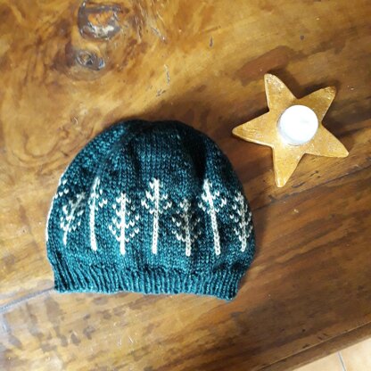 This hat is worked in DK yarn and features a stranded motif design of trees.