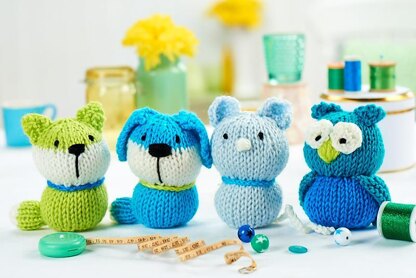 Each of these little animals are quick to knit little mascots, or could be used as pincushions. The pattern includes four animals: Cat, Puppy, Mouse and Owl. Designed by Amanda Berry @fluffandfuzz, the toys are knitted in acrylic aran yarns on single pointed needles (not in the round). Each of the animals use the same head and body pattern but are worked in different colours. The animals are knitted on single pointed needles; the crochet hook is used only to make the single crochet chain collars and the mouse’s tail. For confident beginners and above, other techniques used include casting on and off, knits, purls, increases and decreases, and seaming to finish.