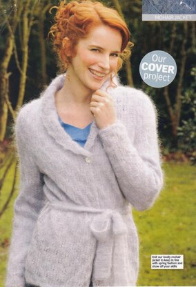 This is a pattern for a Pine Cone Lace Cardigan, originally published in Knit Today. It has an all over pine cone lace stitch with garter stitch edges and tie belt. The collar is knitted separately. The yarn is no longer available, any yarn knitting to the tension can be used. Photo Knit Today.