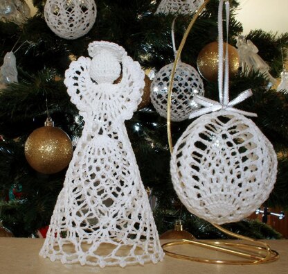 Pattern include written instructions as well as a stitch diagram. It also includes complete instructions on how to stiffen both the angel and ball ornament. It also includes a printable template to make the form for stiffening the angel.