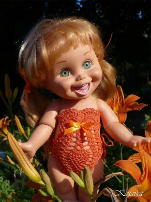 This Pattern Crochet is for the Galoob Baby Face dolls outfit, which include the pattern for swimsuit. In the pattern is given two versions of swimsuit top, so using this pattern you can crochet 2 different swimsuits. This can be made to fit an other 12” doll, for example, Kidz n Cats dolls