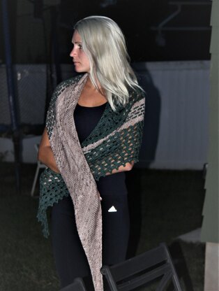 Pinelands shawl is an asymmetrical, triangular shaped shawl worked in two colors of DK weight merino wool. The shawl is worked end to end on the bias with two increases on one end and one decrease on the other, creating the asymmetry. It features stockinette, two simple lace patterns and a garter slip stitch pattern. Using only 230 yards of each color this shawl will fly off your needles and onto your shoulders in no time at all. Stitch patterns are provided in both charted and written out instructions.