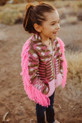Red Heart Super Saver worsted weight yarn 14 [15, 16] oz. Pink Camo 2 oz. Petal Pink 1 oz. Pretty ‘n Pink Size H (5.0 mm) crochet hook (or size needed to obtain gauge) Yarn needle 13” [14”, 15”] white sweater zipper