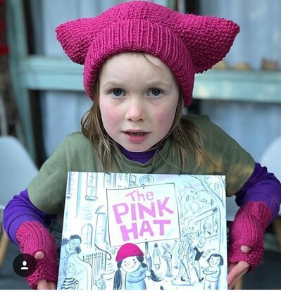 I designed this child size Pussyhat Beanie in DK as I could not find one . I needed it for a gift for a grandchild to accompany the picture book by Australian author , Andrew Joyner who explores the journey of one of the pink pussyhats destined for the a Women’s March in Washington DC in January 2017 . Pinky now has her very own hat .