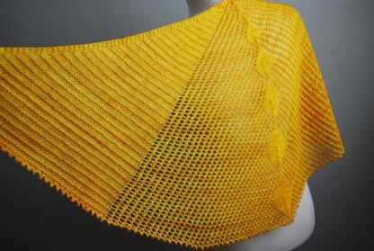 This top-down crescent shawl combines the texture of stockinette and garter stitch stripes with the elegance of lace. Starting with a garter tab, the shawl gently increases every right side row to form a lacy center panel flanked by more solid sections. The leaf motifs that cascade down the center of the shawl grow in size as the shawl gets wider, and a picot bind-off gives the bottom edge a frilly finish.