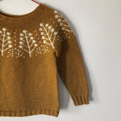 Pins (little) is the kid’s version of the Pins sweater. It is a sweater with a colorwork yoke that forms the branches of pine trees. It’s up to you to choose the colors to knit some pretty duets!