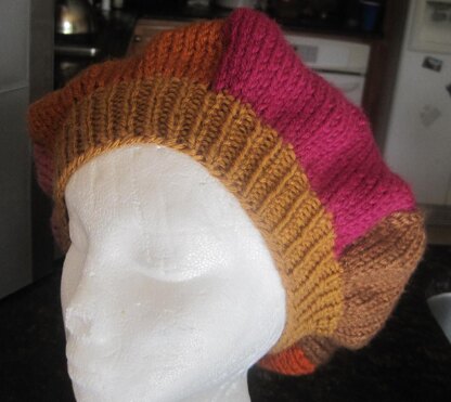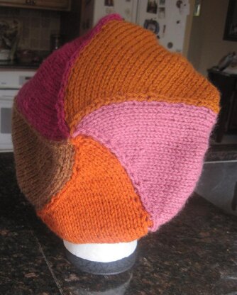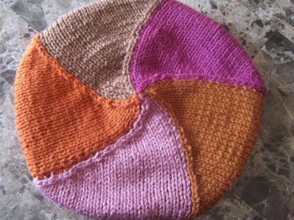 A cute introduction to intarsia knitting, you can use up small amounts of yarn leftovers with this quick and easy beret, which is knit flat and seamed. Knowledge of Knit, Purl, increases and decreases, mattress stitch and the basics of intarsia (wrapping new color) is needed to succeed with this pattern. Uses about 15 grams (25 yards) each of 6 colors of aran or worsted weight yarn.