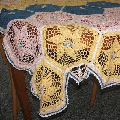 Cotton crochet tablecloth can be done in any color that suits your mood or even in white! Large, easy to do motifs. By adding and joining additional motifs, this can be done in most any size. Also, with a slight change in the motif and a change in colors, you could have a poinsetta tablecloth for the Christmas holidays! Skill Level: Intermediate