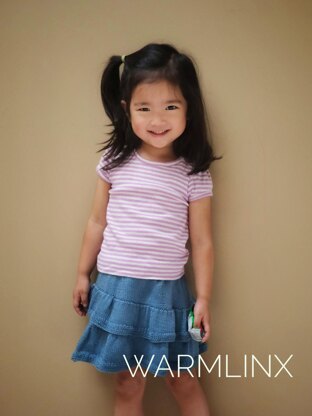 The techniques involved are basic knitting st, M1, Kfb. This skirt is knitted from top down in rounds. All purl stitch in this pattern will be used as a guideline for picking up and knit the upper ruffle. The elastic is added to provide more support and easily to adjust or replace so that the skirt could last longer especially for growing kids.