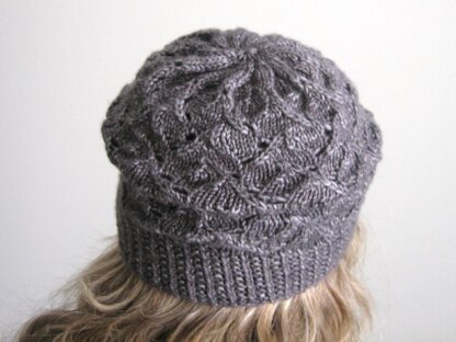 Piper's Hat is a slouchy lace hat with a twisted rib brim. The flowing lace is worked on every round.