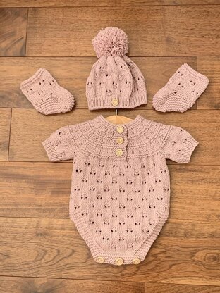 This sweet modern 3-piece Romper design features a textured yoke and an easy eyelet pattern which is then replicated on the hat and booties. The set is knitted from the top down using straight needles and knitted back and forth. meaning very little sewing is required and fewer seams.
