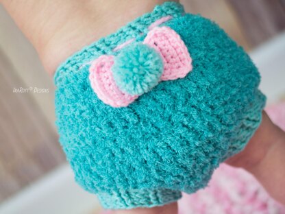 This pull-on diaper cover is oh-so-snuggly! Made out of soft and squishy Bernat Pipsqueak yarn that works up fast. The instructions are written row-by-row in American crochet terms, along with crochet diagrams, step-by-step photos, and a conversion chart to UK terms.