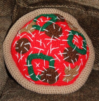 This pillow looking like a stuffed pizza would make a great gift for the teen in your life, especially boys. The pie is made from two crochet rounds that are then crocheted together. The crust edging is then crocheted onto the rounds, stuffed and sewn down. The pizza ingredients include mushrooms, pepperoni, and green pepper slices that are crocheted separately and sewn to the pillow front. The "cheese" is embroidered straight stitches.