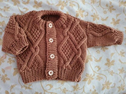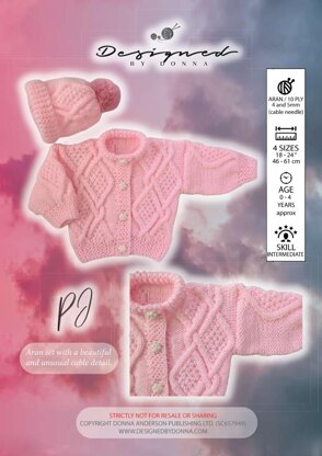 PJ is a beautiful set of Cardigan and Hat with an interesting cable. Aran knitting has evolved as have the colours and I have incorporated both in my designs.