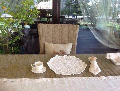 Measurement of the placemat will be around 13”/33 cm and the coaster will be around 4,5" /12 cm in diameter. Size 3/DK/Light worsted weight yarn is used on this design.