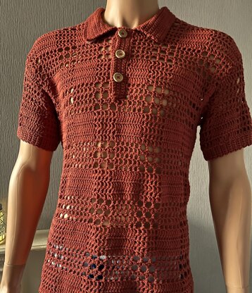 This crochet pattern is for a classic men's polo t-shirt, with three techniques combined to create a plaid effect. Two of these techniques are mesh so the shirt is light and cool to wear. I have included two arm hole designs, with instructions for a short sleeve or a sleeveless version. The pattern was designed using DK cotton, so the t-shirt is light and cool. The garment is made in four pieces and then sewn together. The instructions include lots of detail to ensure complex shaping is made easy. There is a photographic guide on how to add the button bands and collar. There is a lot of stretch in the finished item, so the sizing is only approximate. I have listed this pattern as "advanced" because of shaping and pattern techniques.