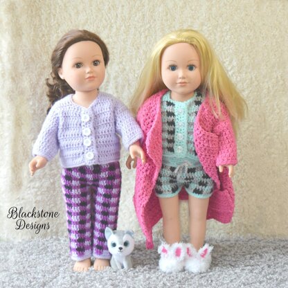 The Plaid Pajamas Set for 18” dolls comes with instructions to make a long sleeve or short sleeve shirt, shorts or pants, fuzzy slippers, and a robe.
