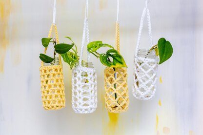 These cute crochet hanging vases are a great way to dress up and reuse spice type jars. They work up really quickly with a small amount of yarn, making a perfect unique and useful last minute gift. Pattern includes three variations…. A boxy filet mesh, a lacy v-stitch, and a classic lattice. Each can be adjusted to shorter or taller jars. A perfect way to propagate plant cuttings in a sunny window or show off cut flowers from your garden.