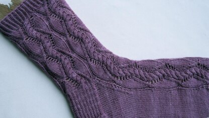 This is a pattern for a pair of socks that is knit from the top (cuff) down on two circular needles, with an optional 12-inch needle. The stitches combine the best of two worlds: cable and lace. The placement of the stitches causes one to scratch their heads at how the stitches seem to wander, fooling even those philosophers at the symposium. The cable is tight enough so that the sock is still warm despite the lace treatment, however it is knit with lightweight sock yarn, making it the perfect sock to wear with capri's in the spring, so that you can show off your knitting prowess. The pattern is written for two circular needles. The focal stitch is both written out and charted. The directions are written for all three sizes: Small, Medium and Large Skill Level: Intermediate - Intermediate + (assuming a basic knowledge of knitting, cabling and lace). The yarn used to make the sample pair is Lorna's Laces Shepherd Sock yarn in the colorway called Blackberry.