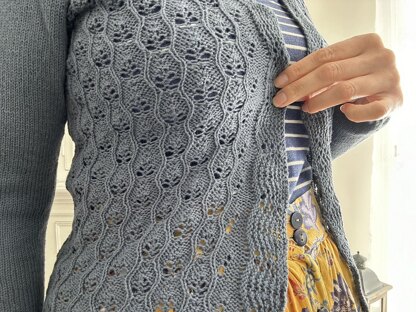 Yarn : This cardigan is knit with a fingering weight yarn 250m/50g (here : Cotton merino from Knitting for Olive, col : Dusty blue whale) Approx. : 1030, 1150 (1275, 1400, 1520) 1645, 1770, 1890 m // 1126, 1265 (1395, 1530, 1665) 1800, 1935, 2070 Yds.