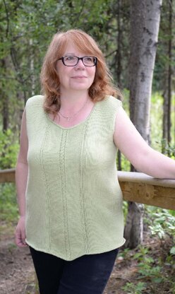Poeta is a seeveless tank knit in the round from the bottom up starting with an I-cord cast on. Gentle A-line shaping with positive ease at the hips and negative ease at the bust. The tank is knit flat separately from the armholes up and is joined at the shoulders with a 3 needle bind off. The centre front panel features a centre cable flanked by diagonal borders that are created by increases and decreases that also create a gentle vee at the hem and neckline. Additional finishing touches include applied I-cord at armhole and neck edges.