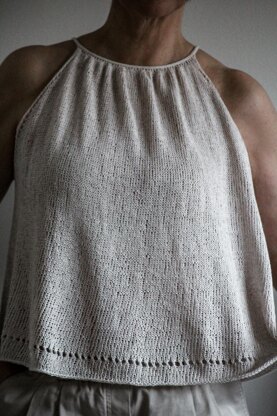 The charm of this minimalist top lies in the gathers at the neckline and the rows of eyelets created by yarn overs that adorn the armhole edges and hem. The thin knit fabric drapes beautifully. The pattern is worked from the top down. The neckline is started with an I-Cord knit tube, from which stitches are picked up for the back and front pieces. First, the back piece is worked flat, then the front piece is worked flat. Stitches are cast on for the underarms, and the lower part of the top is knitted in the round downwards. The back piece is worked with more rows to add length to the back, allowing the top to drape nicely. The hem is finished with an I-Cord.