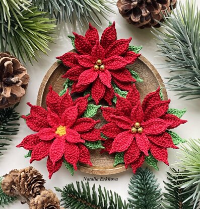 In this Poinsettia pattern you can find information on how to make a flower, a brooch, a keychain and a ring for a napkin Also the pattern shows examples of room decoration with crocheted flower.