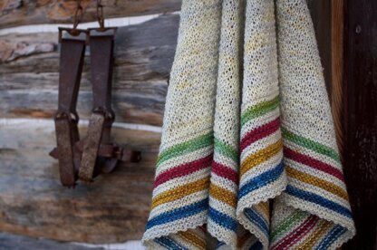 Point is a textured, woven-look shawl with a striped garter stitch edging reminiscent of and inspired by vintage trade blankets.