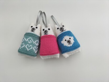 This is a knitted decoration of a polar bear. It is a digital knitting pattern. This pattern has written instructions for all designs and charts for two of the designs. The polar bear has a plain jumper for the beginner knitter. Then there are two extra designs for the polar bears jumper. The polar bear face. [intarsia], and the small Fair isle pattern of hearts and waves. Polar bears love the sea. This decoration is knitted in the flat using double knit wool and a pair of 2.25mm needles. I've used King Cole Glitz in Adriatic and Sea breeze, Sirdar Country Classic in White and King Cole Value knit in Fuchsia. The size of the decoration is length 11.5cm/4.5" and Width is 3"/7.5cm. Gauge is 8sts - 10 rows = 1 inch.