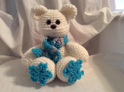 This is a pattern for a polar bear lovey or security blanket , complete with little snowflakes on its feet.