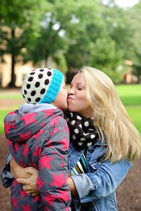 This mama is crazy about polka dots because there is something innately happy about them. My boys also absolutely love it when I wear something they consider interesting. Thus, funky colorful hats for them, and neutrals in a basic infinity cowl for me. • Colorwork is stranded, hats are worked bottom-up and the cowl is worked sideways in the round and grafted for a seamless finish.
